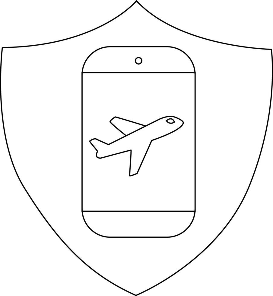A line drawing shows an airplane in a mobile phone on a shield background Pro Vector