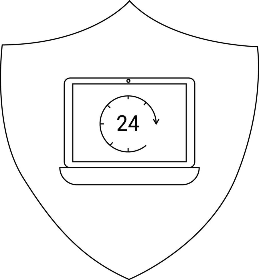 A laptop inside a shield displays 24 with a curved arrow suggesting roundtheclock availability or security Pro Vector