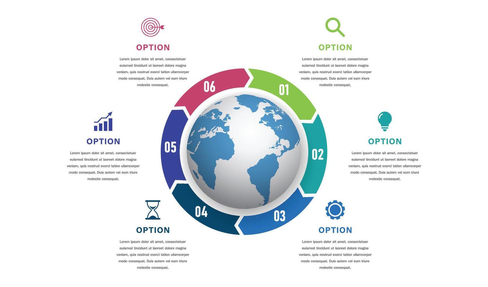 6 Option Circular Infographic with Globe and Icons Pro Vector
