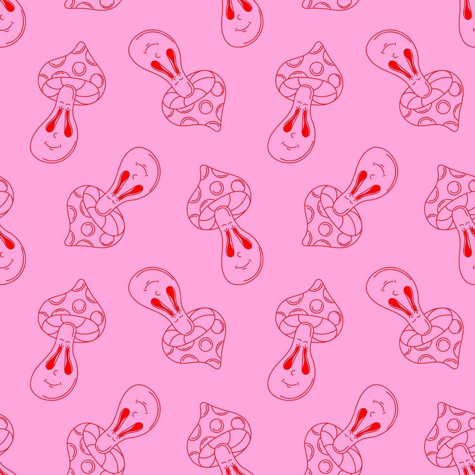 Seamless pattern with cute smiling groovy style mushroom on pink background. Cartoon character design for wallpaper textile or wrapping paper. vector