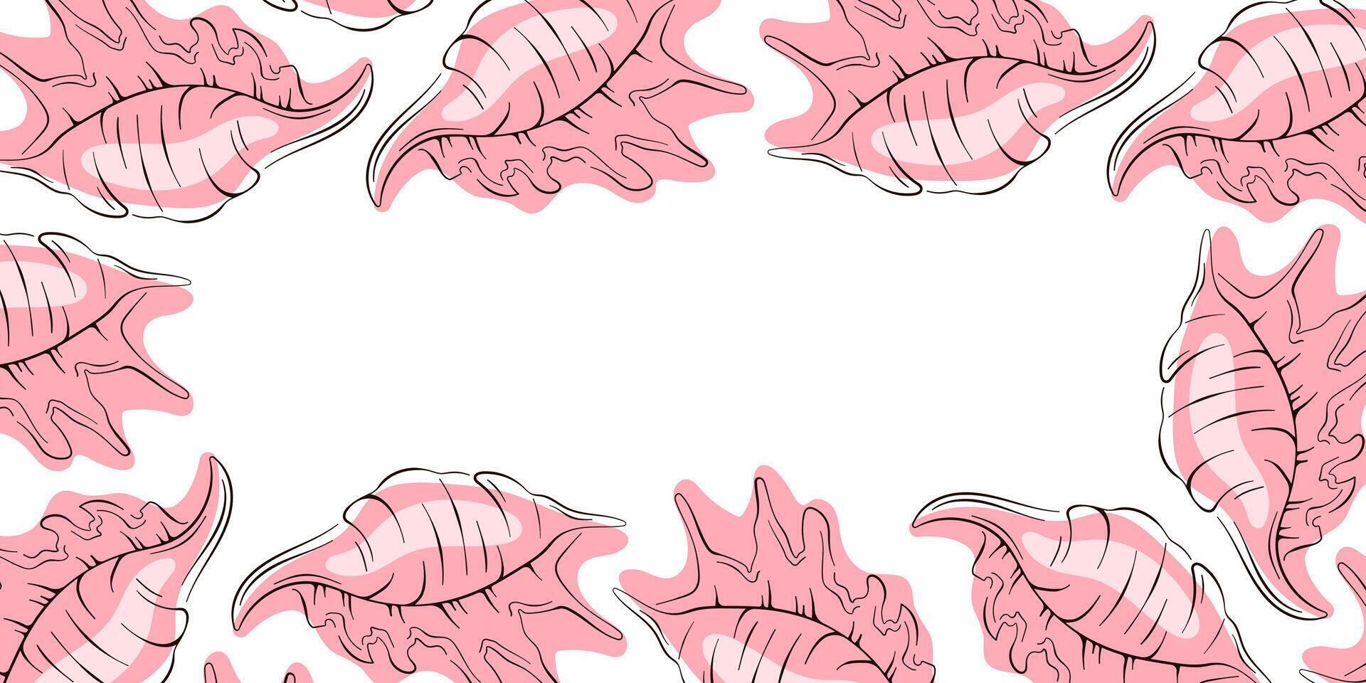 Pink seashell border frame with conch shell on a white background in flat style with copy space. Pro Vector