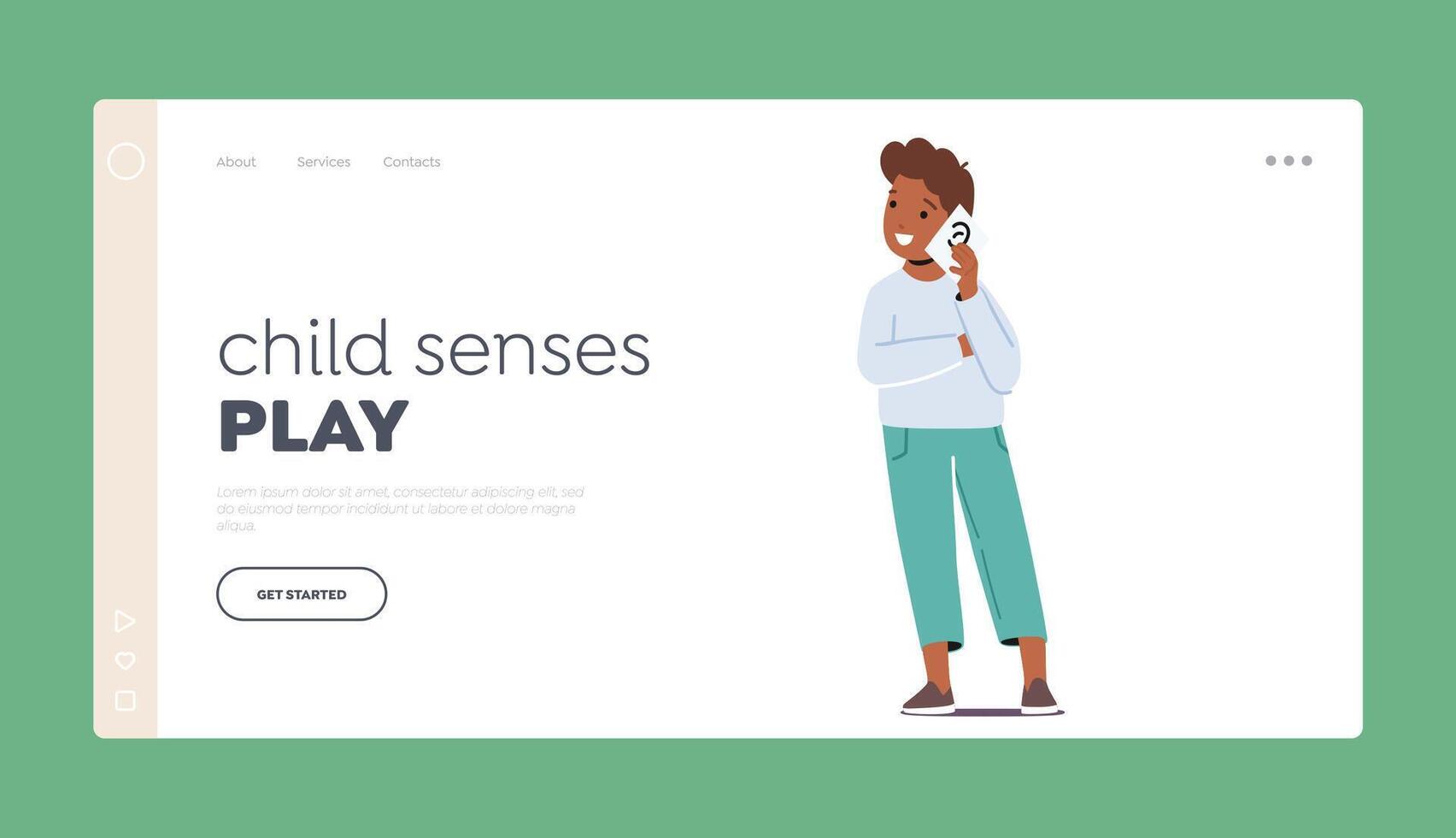 Child Senses Play Landing Page Template. Little Boy Character Stands With A Card Displaying A Drawing Of An Ear Pro Vector