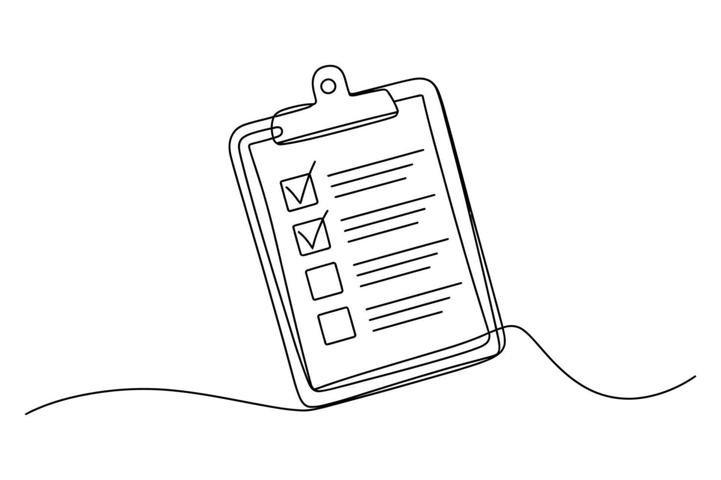 Minimalist continuous line drawing of a clipboard with a checklist and three completed tasks symbolizing progress and accomplishment Pro Vector