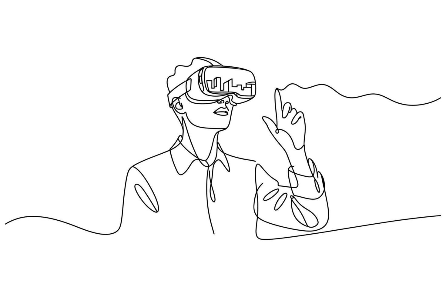 Person wearing virtual reality headset interacting with digital interface using hand gestures in minimalist line art style Pro Vector