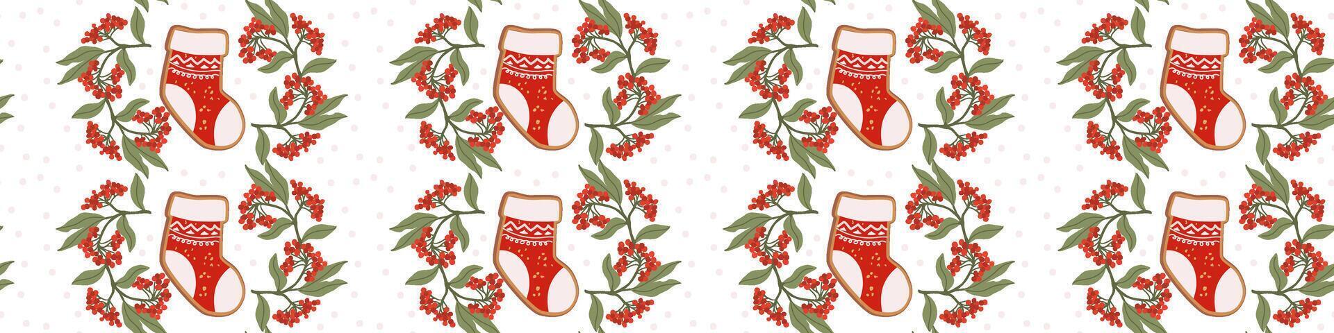 Christmas horizontal pattern with xmas cookie sock and cotoneaster. Pro Vector