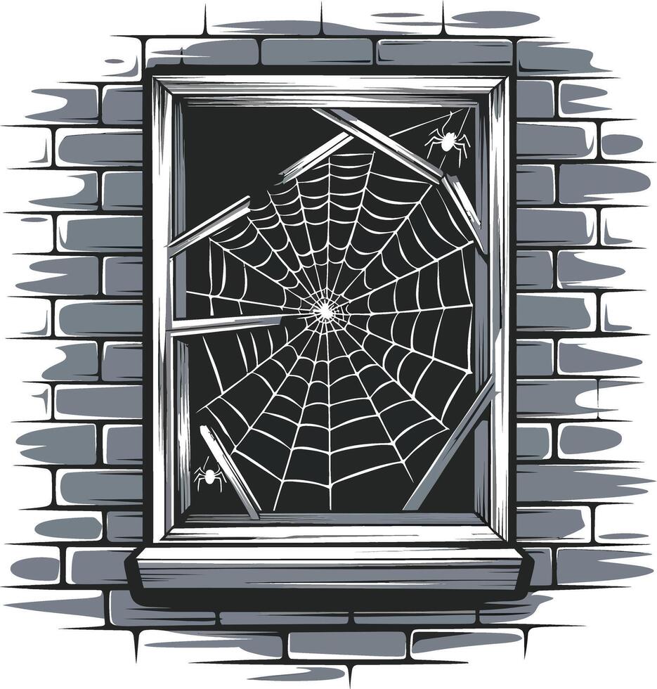Spiderweb in Broken Window of Old Building - Illustration Pro Vector