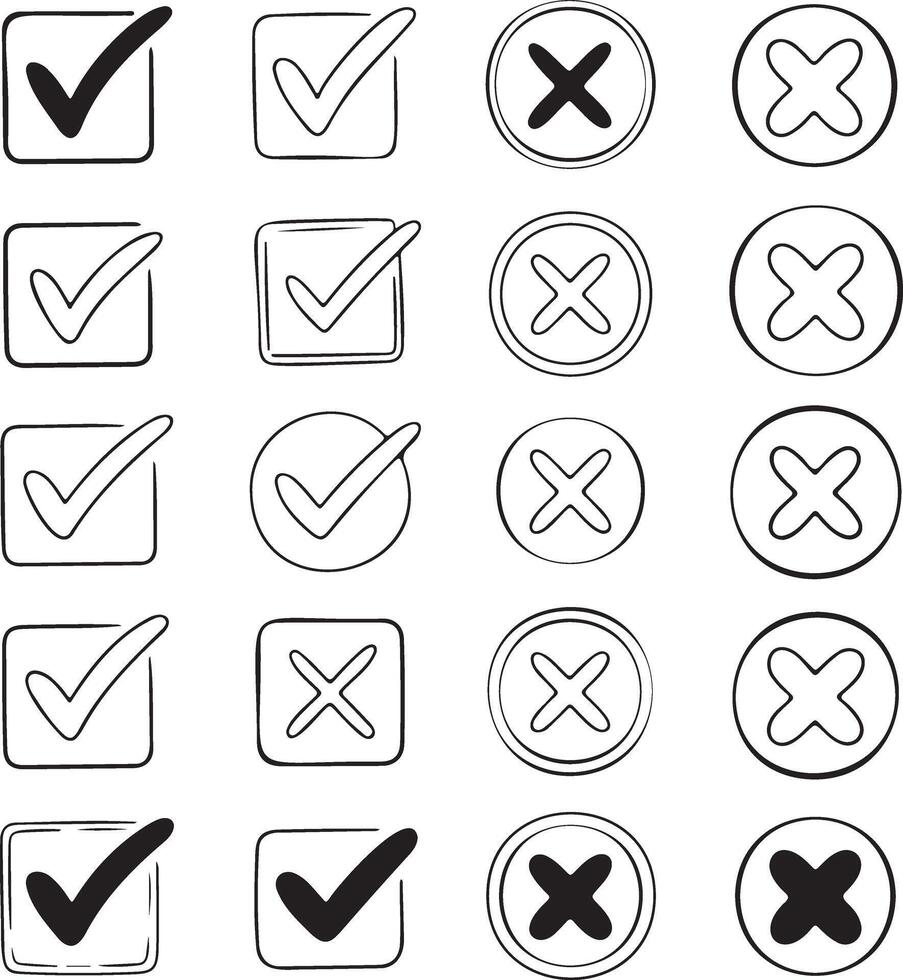 Collection of hand drawn checkmarks and crosses in boxes and circles Pro Vector