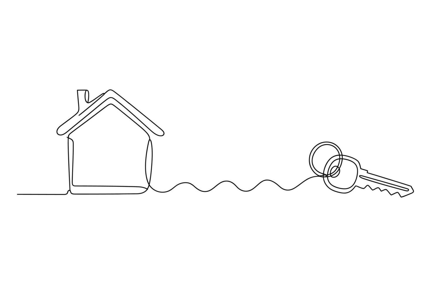 Minimalist single line drawing of a house and keys symbolizing home ownership and new beginnings Pro Vector