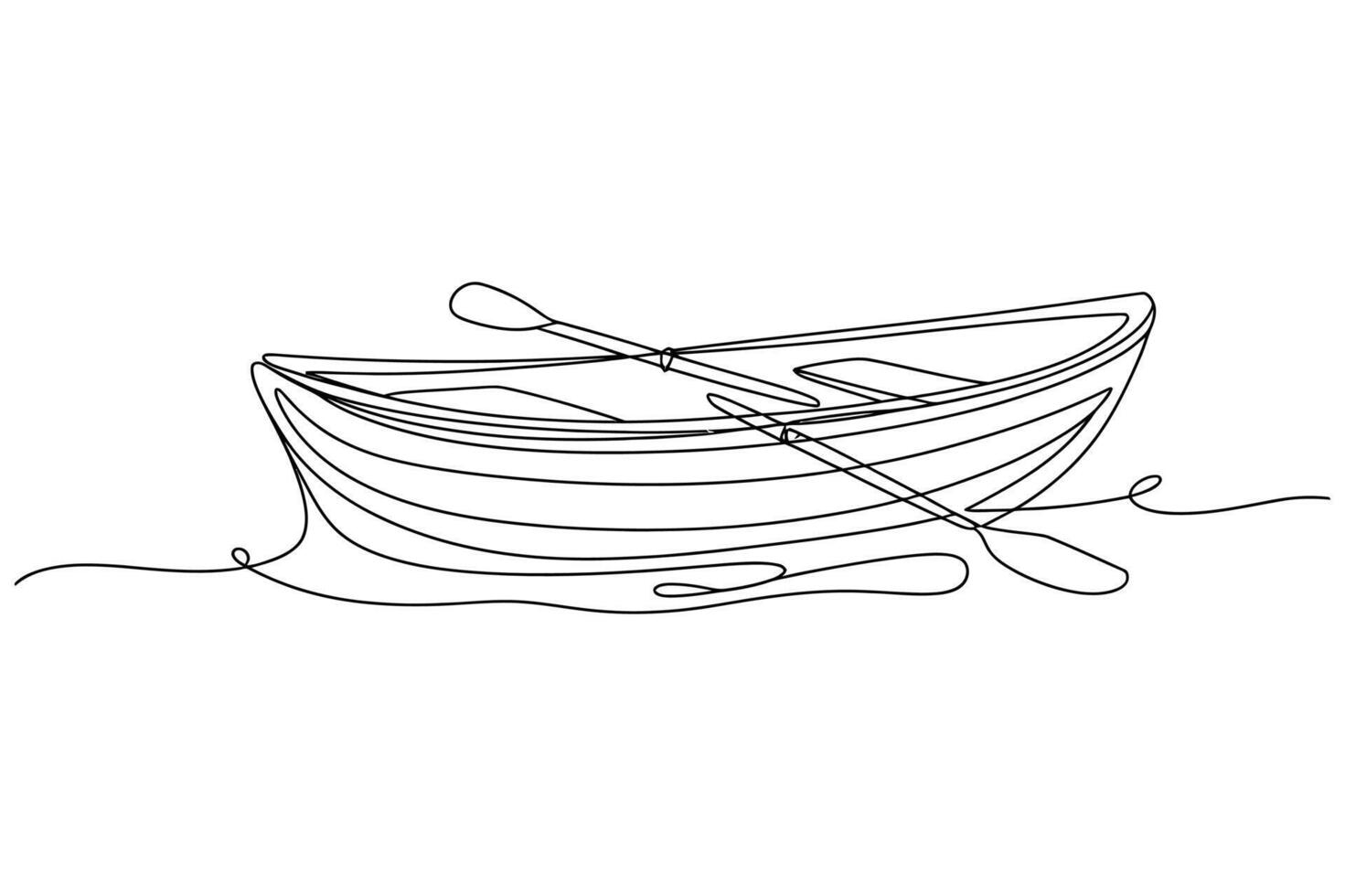 Minimalist single line drawing of a rowboat with oars resting inside floating on calm water Pro Vector