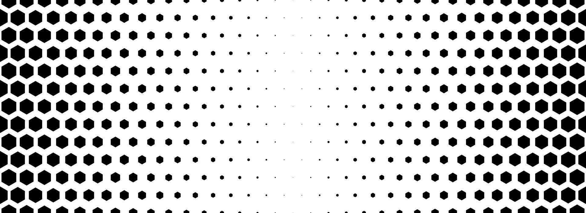 Black hexagon gradient texture. Vanishing honeycomb pattern background. Geometric hexagonal halftone tech overlay backdrop. Fading grunge halfton wallpaper. Retro dot texure wallpaper Pro Vector