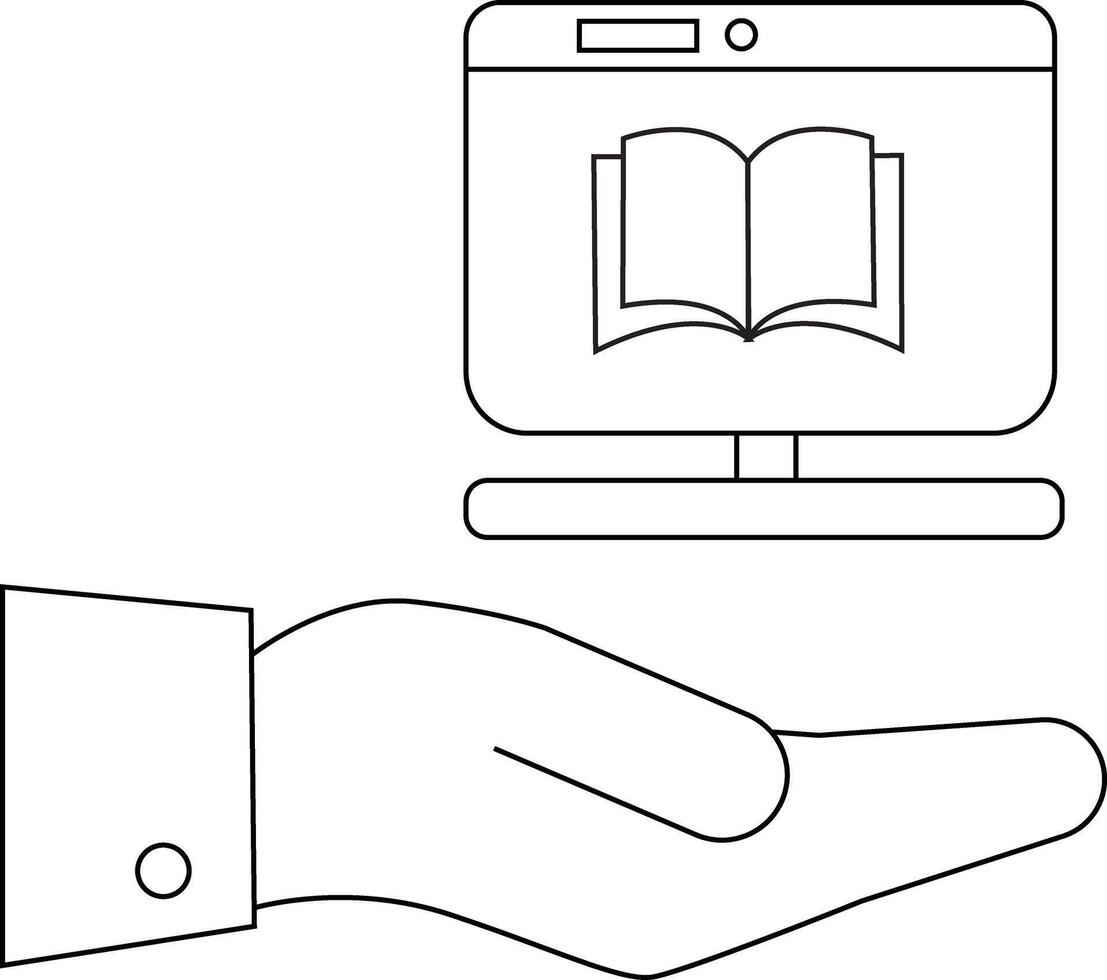 Line art shows a hand holding a monitor displaying an open book Pro Vector