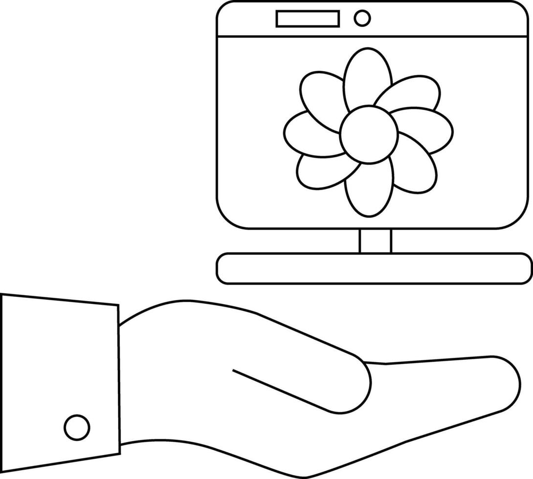 A hand appears to be holding a desktop computer with a flower on the screen Pro Vector