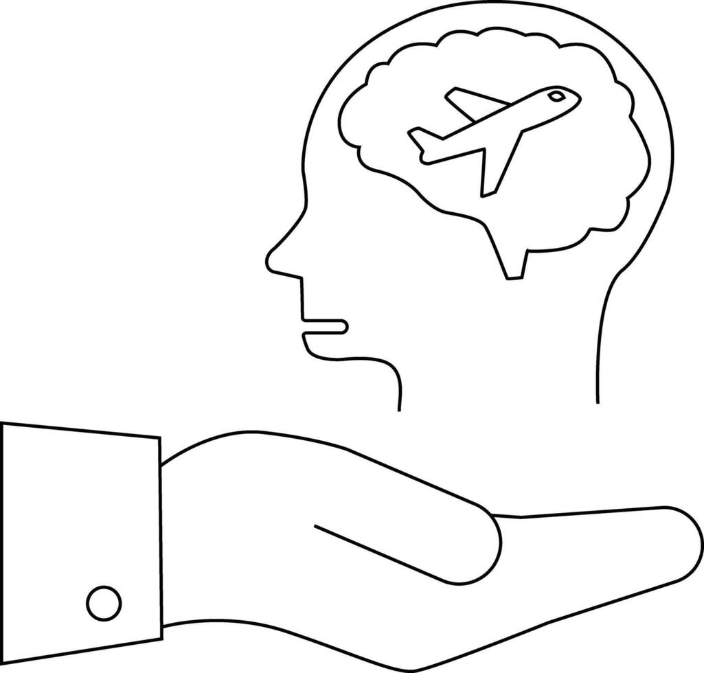 Line art displays a brain in a head with an airplane inside floating above an open hand in a suit Pro Vector