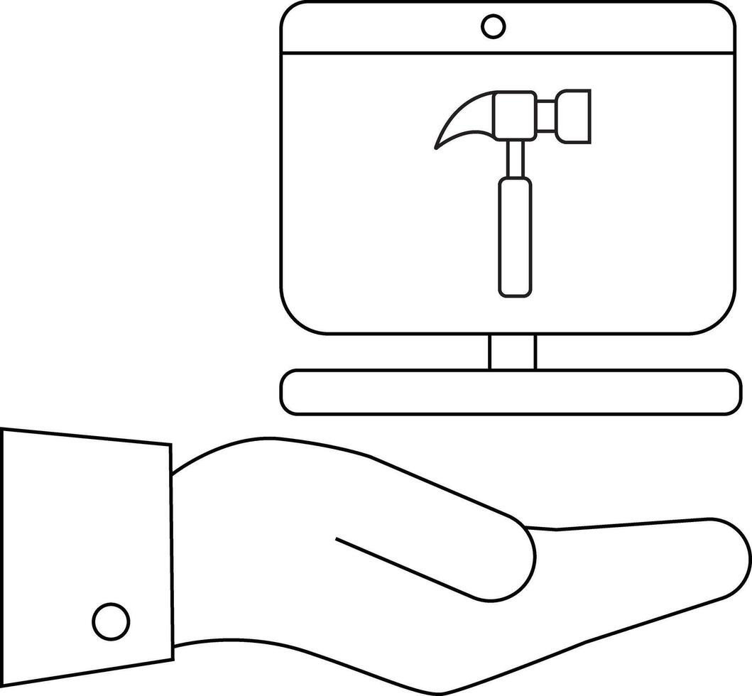 A hand holding a computer monitor with a hammer on the screen Pro Vector
