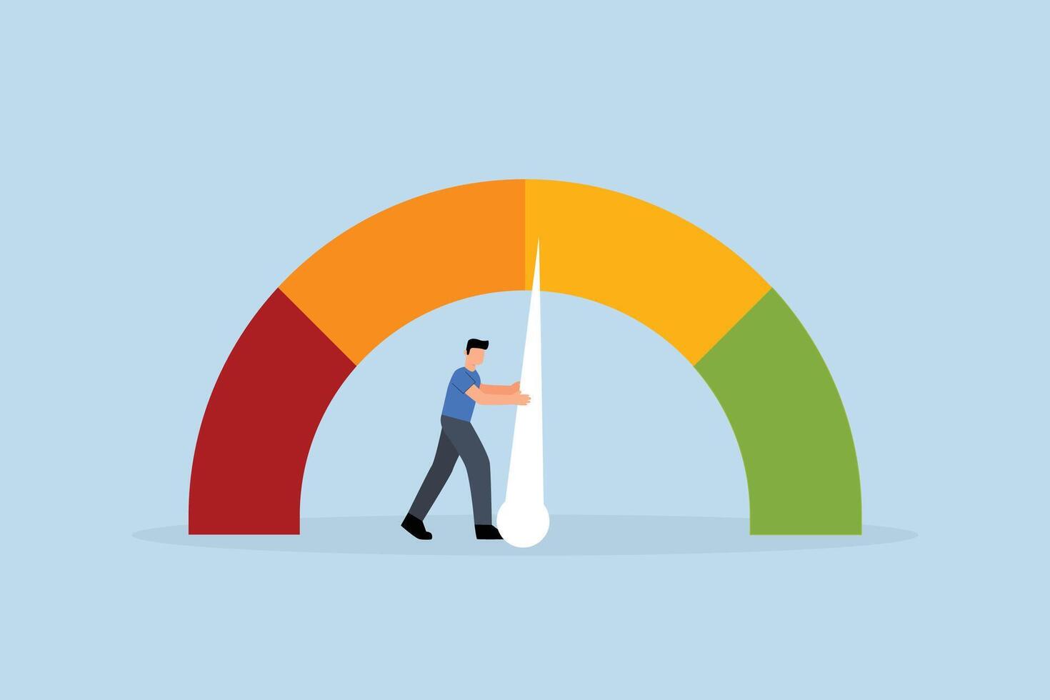 Push skill level, businessman pushing skill performance gauge Pro Vector