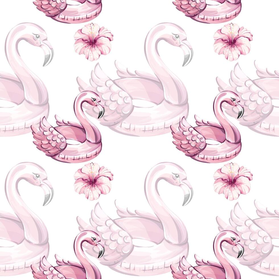 A delightful seamless pattern showcases pink flamingo pool floats surrounded by vibrant tropical flowers, creating a festive summer atmosphere suitable for beach themed designs. Pro Vector