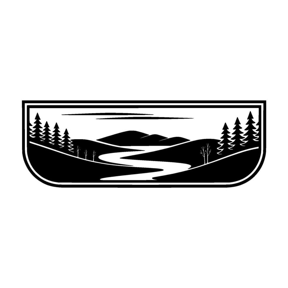 A minimalist landscape illustration featuring a winding river flowing through rolling hills and stylized pine trees contained within a rounded rectangular frame Pro Vector