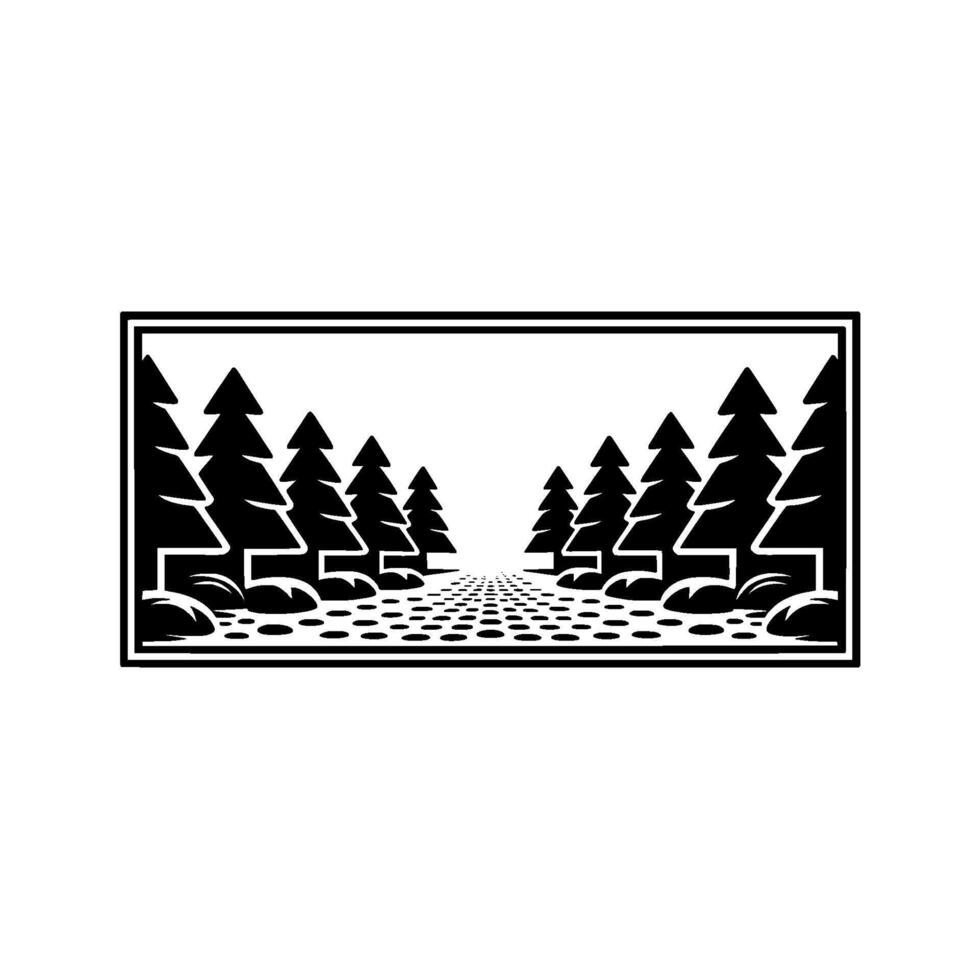 Stylized illustration of a symmetrical forest pathway leading into a vanishing point perspective with stylized pine trees Pro Vector