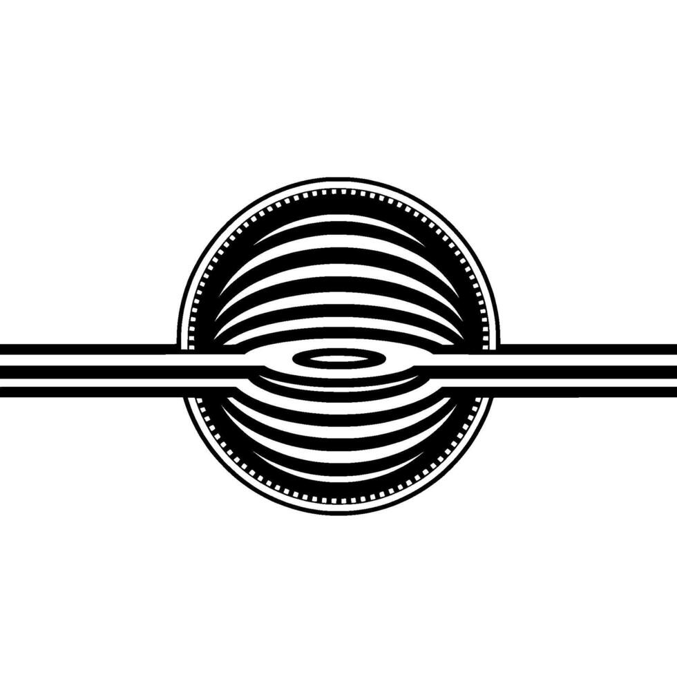 Striking abstract geometric illustration featuring a central circular with concentric curved lines intersected by a horizontal band of parallel lines creating an optical illusion effect isolate Pro Vector