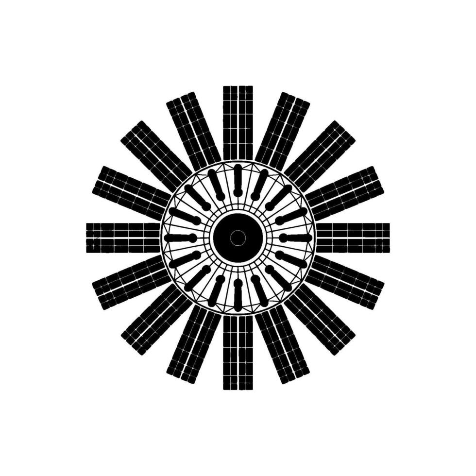 Geometric circular emblem featuring radial symmetry with radiating rectangular solar panels and internal concentric circular elements Pro Vector