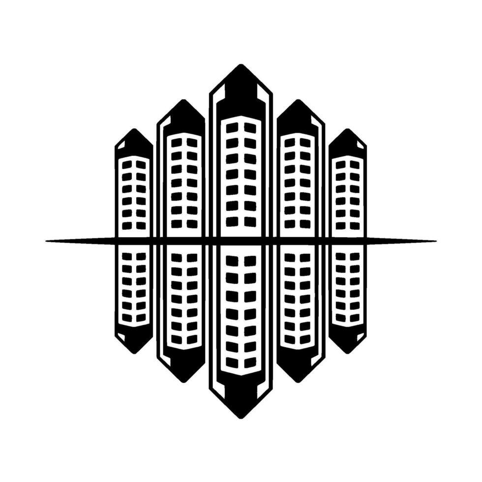 A striking silhouette of a symmetrical cityscape with five distinct skyscrapers reflected below a horizontal dividing line Pro Vector