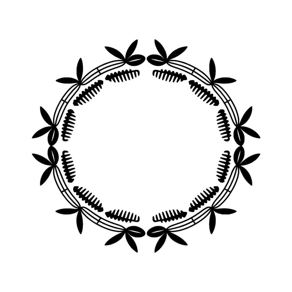 Delicate line art floral wreath composed of stylized leaves and segmented flower elements arranged in a circular frame Pro Vector
