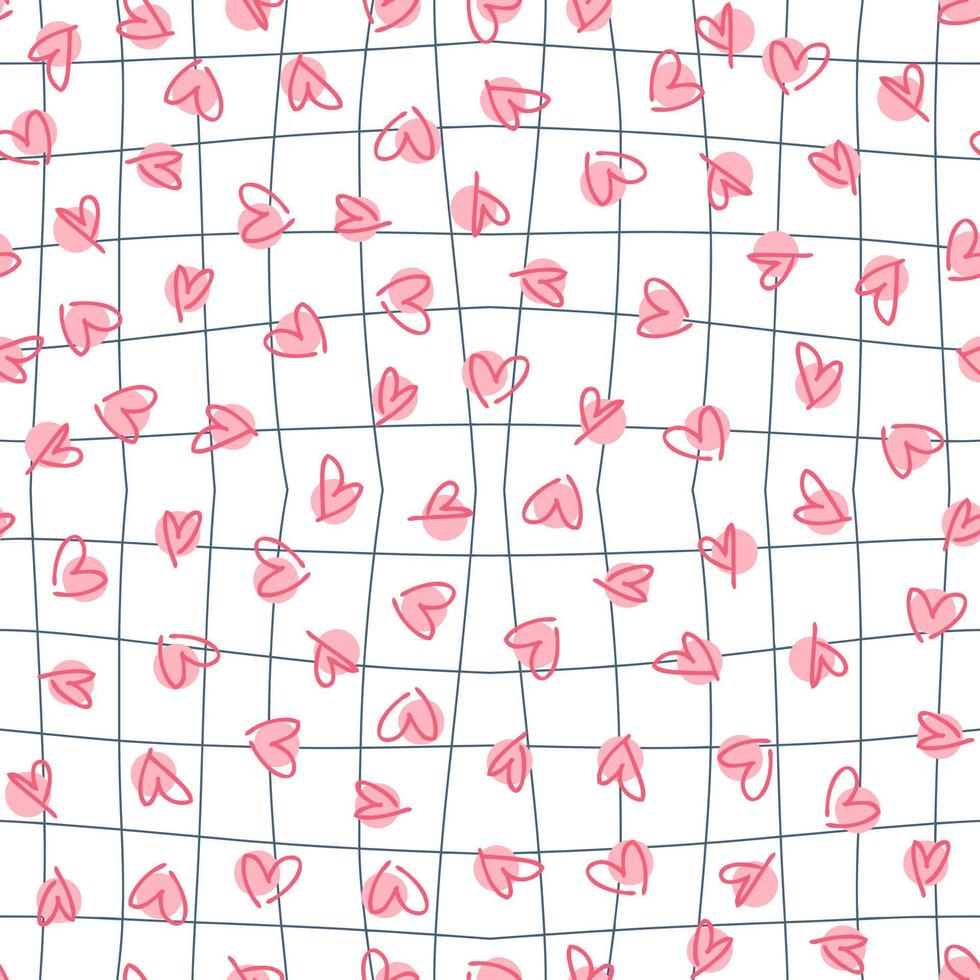 Trippy grid seamless pattern with simple hearts and spots. Pro Vector