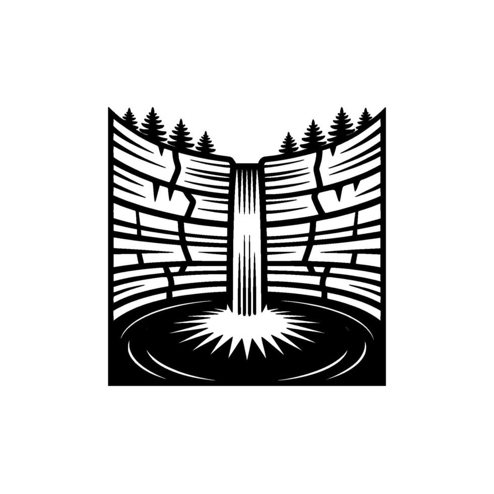 Stylized illustration of a cascading waterfall plunging into a circular pool with radiating ripples and evergreen trees atop jagged cliffs Pro Vector