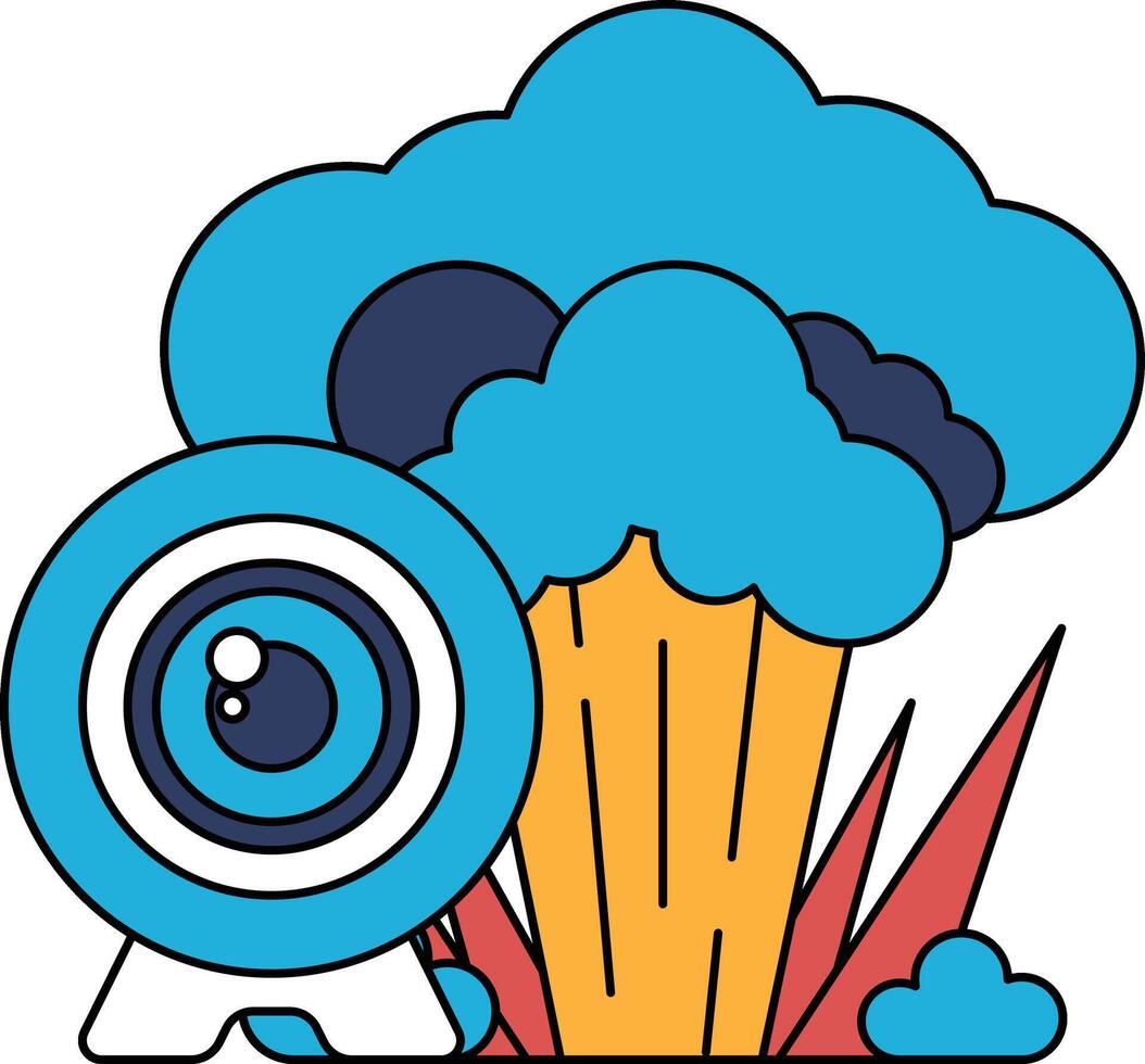 A black and white drawing of a camera with a lens and a cloud in the background Pro Vector