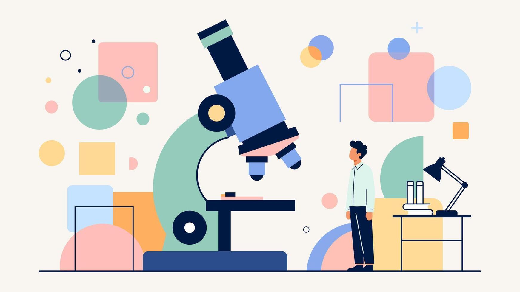 Giant Microscope Science Learning Illustration. Students learn science with a giant microscope. Pro Vector