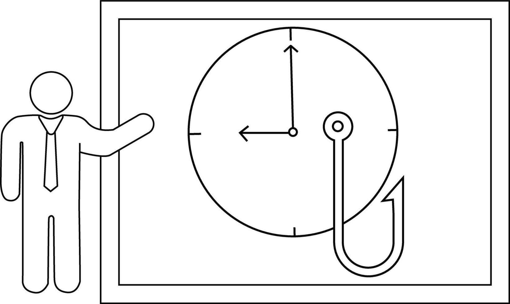 A stick figure presents a clock with a fishing hook for a second hand inside a rectangular frame Pro Vector
