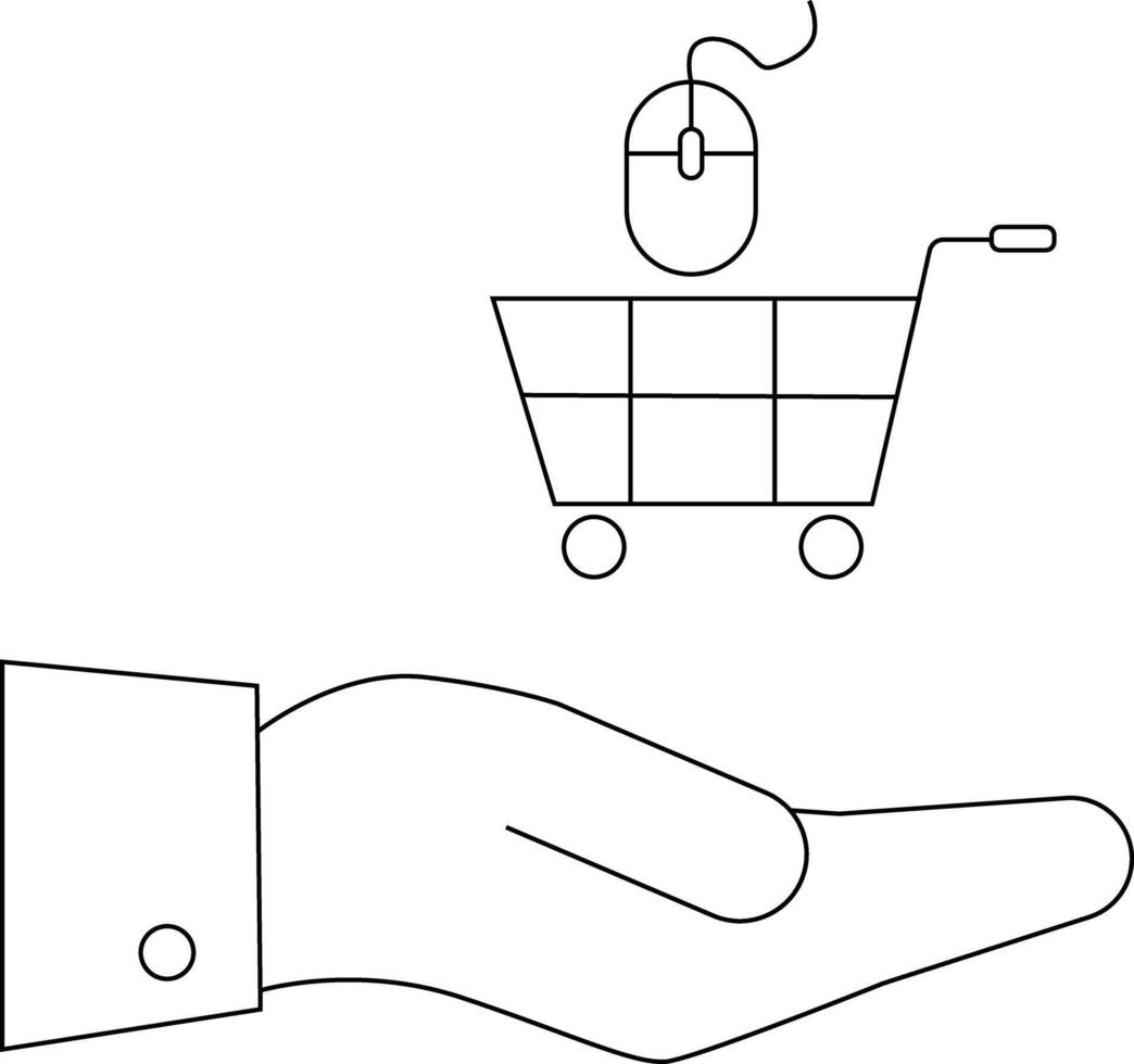Outline image of hand holding shopping cart with computer mouse floating above it Pro Vector
