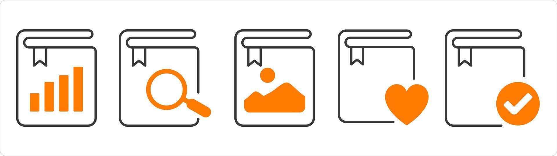 A set of 5 document icons as graph book, search book, image book Pro Vector