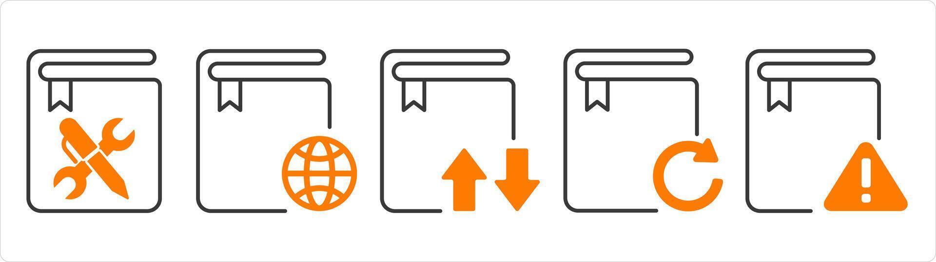 A set of 5 document icons as instruction book, global book, synchronize book Pro Vector
