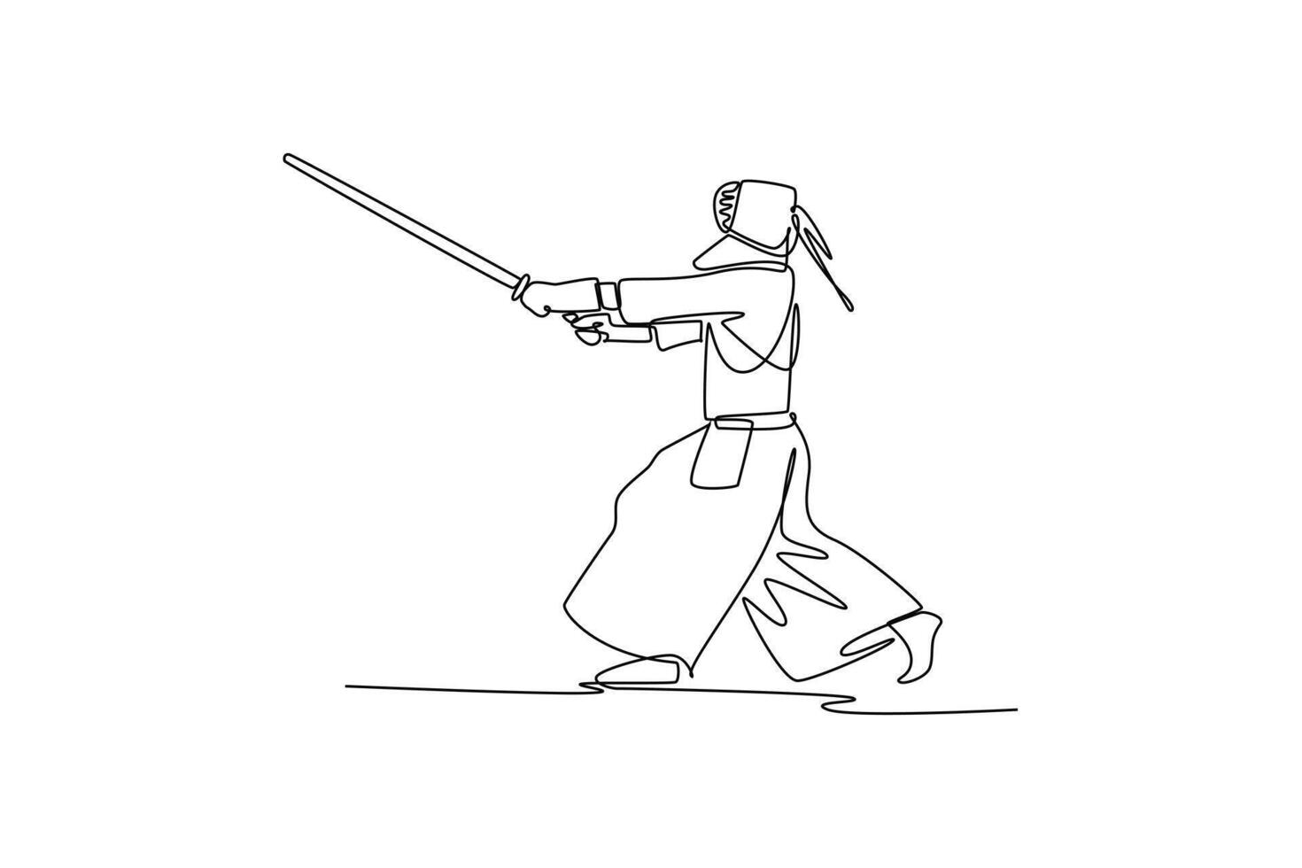 Single one line drawing man Kendo athlete poised in forward stance, lunging to strike with bamboo sword shinai. Discipline and dynamic action. Continuous line draw design graphic illustration Pro Vector