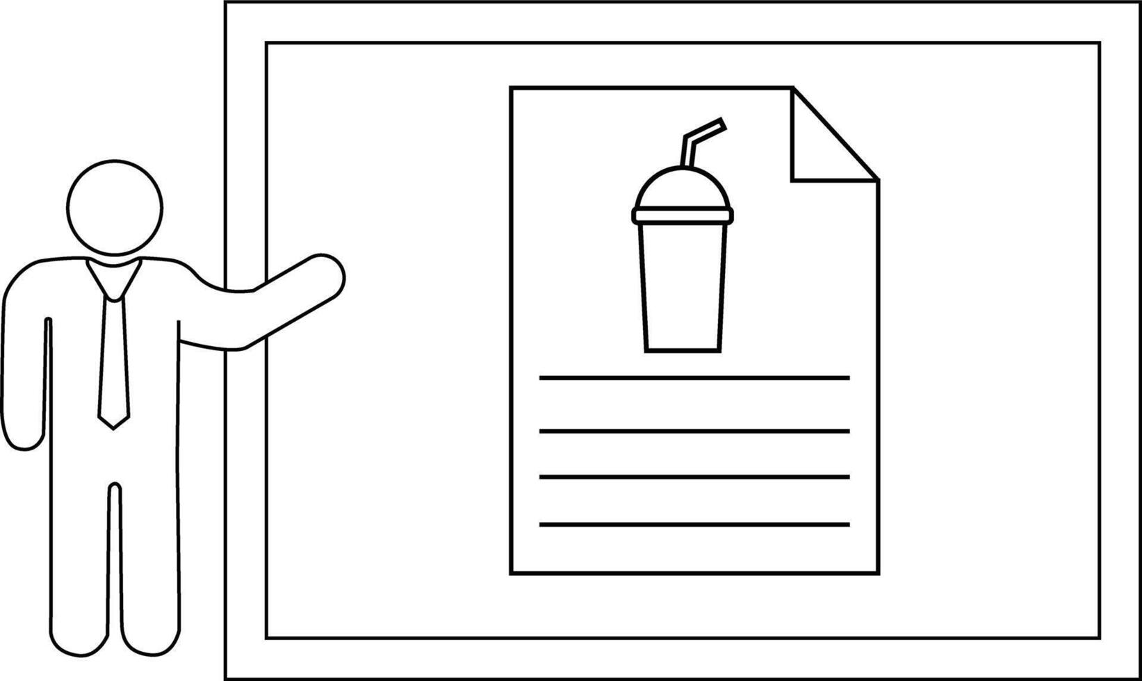 Line art depicts a presenter pointing to a sign with a beverage and text Pro Vector