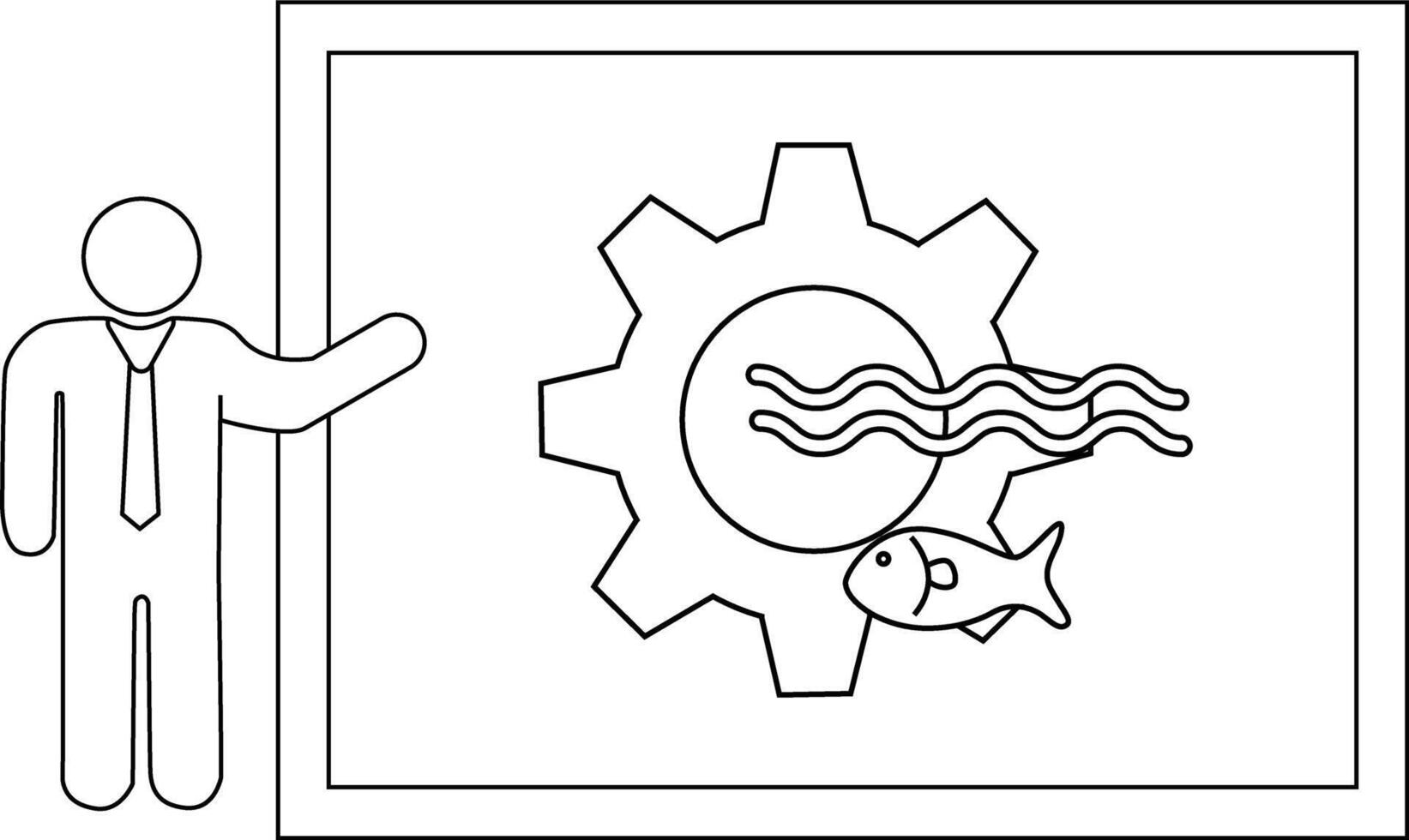 Presentation shows gear waves fish A speaker stands by gesturing towards the display Pro Vector