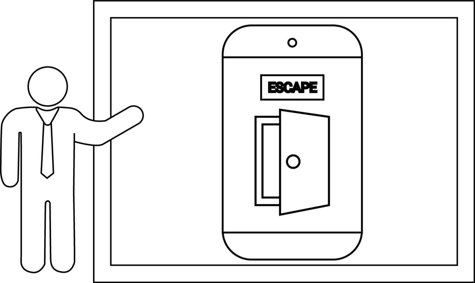 Stick figure gestures towards Escape doorway on a smartphone screen within a frame Pro Vector