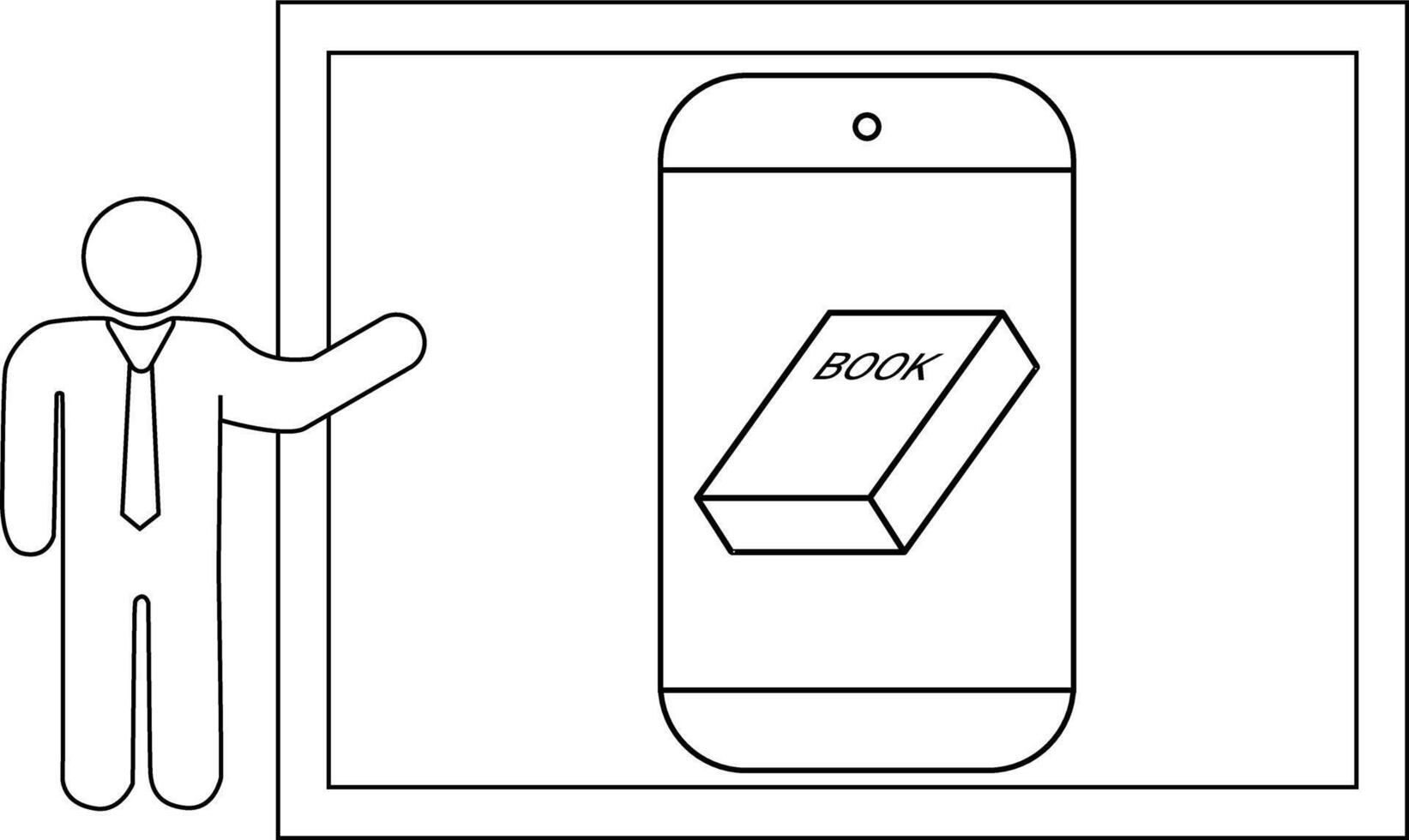 Stick figure presenter shows an ebook on a mobile device inside a frame Pro Vector