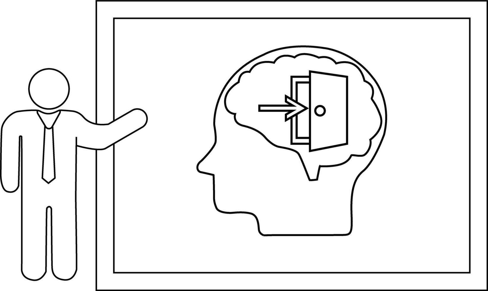A presenter points to a whiteboard showing a brain with an open door and arrow pointing inside Pro Vector