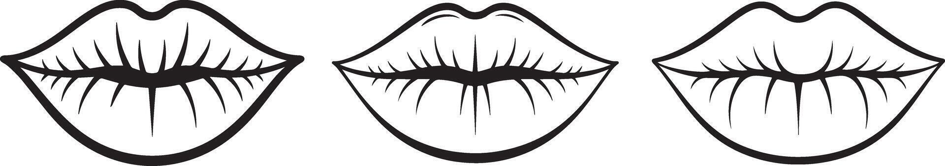 Set of three unique pair of lips line drawing in black on plain backdrop Pro Vector
