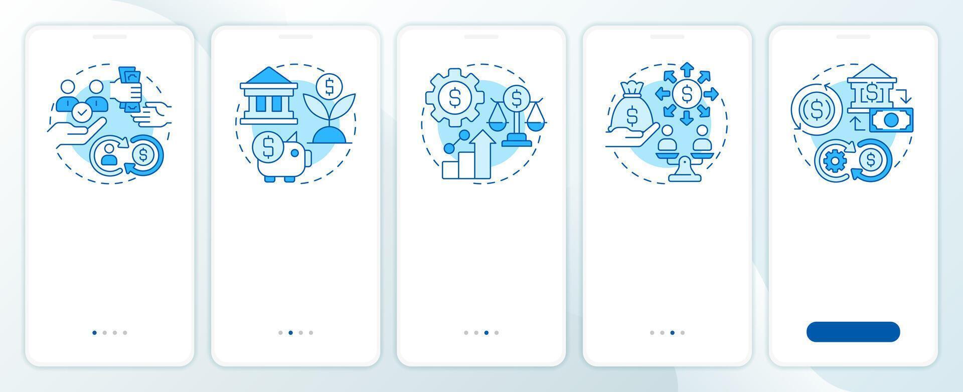 Financial system main functions blue onboarding mobile app screen. Walkthrough 5 steps editable graphic instructions with linear concepts. UI, UX, GUI Pro Vector