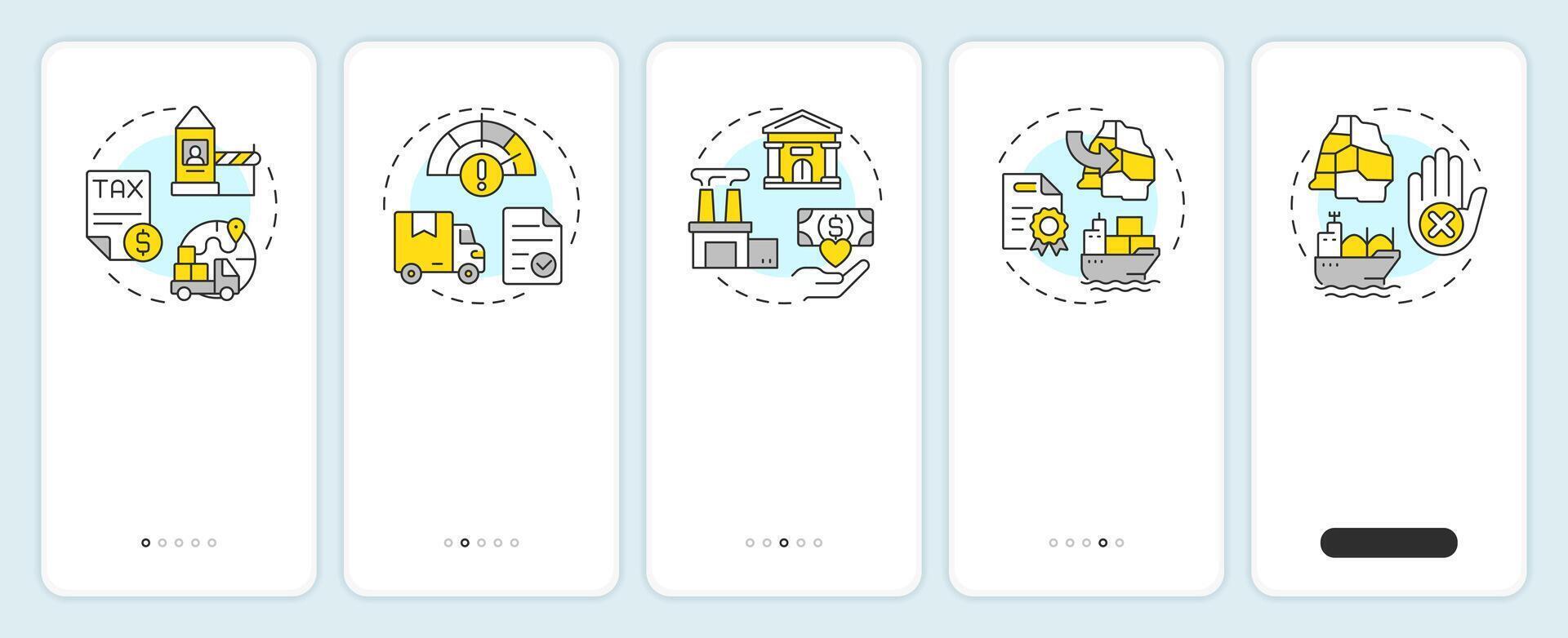 Trade barriers onboarding mobile app screen. Governmental subsidies. Walkthrough 5 steps editable graphic instructions with linear concepts. UI, UX, GUI Pro Vector