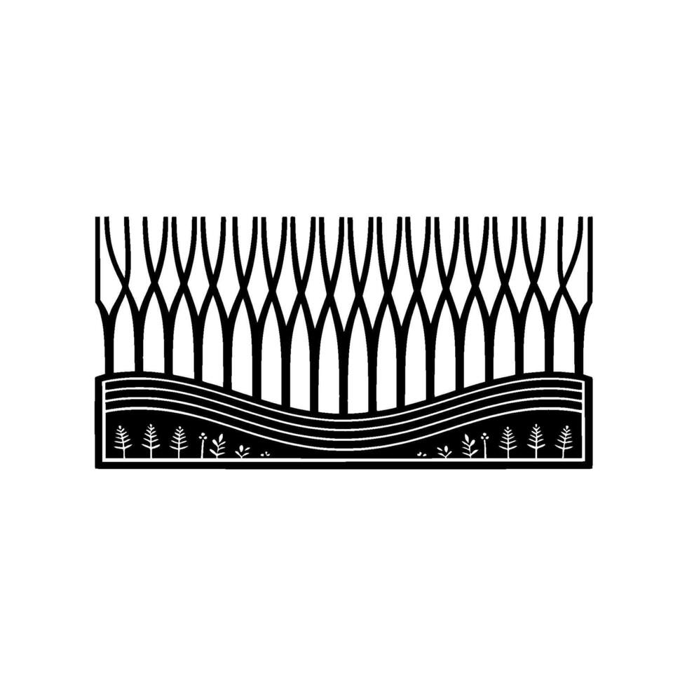 Stylized abstract illustration depicting a dense forest of thin trees above a wavy water element with small foliage patterns Pro Vector