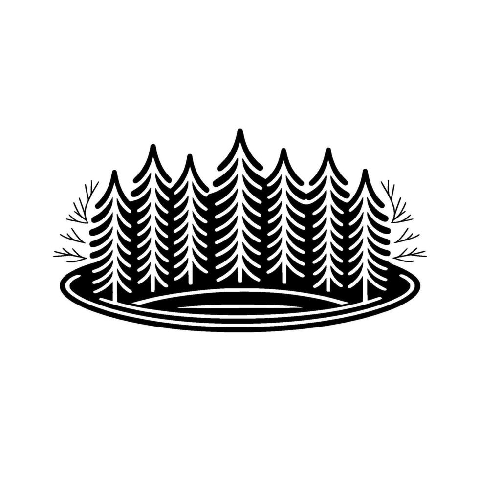 Minimalist stylized illustration of a group of coniferous trees within a circular emblem Pro Vector