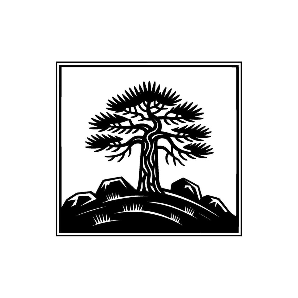 A striking silhouette illustration of a solitary pine tree with dense foliage perched atop a rocky outcrop with sparse grass within a bold doublelined square frame Pro Vector