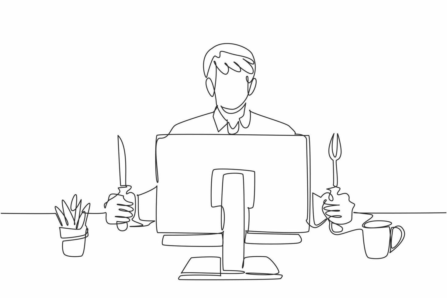 Continuous one line drawing businessman holding knife and fork facing monitor. Starting the morning with breakfast at the office. Efficiency. Deskfast Day. Single line draw design illustration Pro Vector