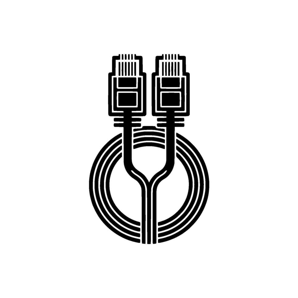 A minimalist illustration of two Ethernet RJ connectors side by side at the top with their cables splitting and forming a circular pattern below Pro Vector