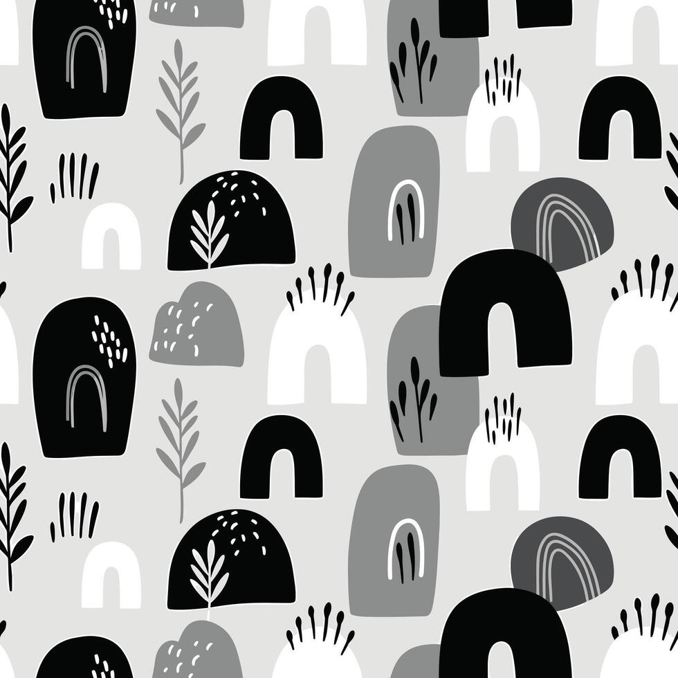 Abstract Boho Scandinavian Seamless Pattern with Monochrome Arches and Plants Pro Vector