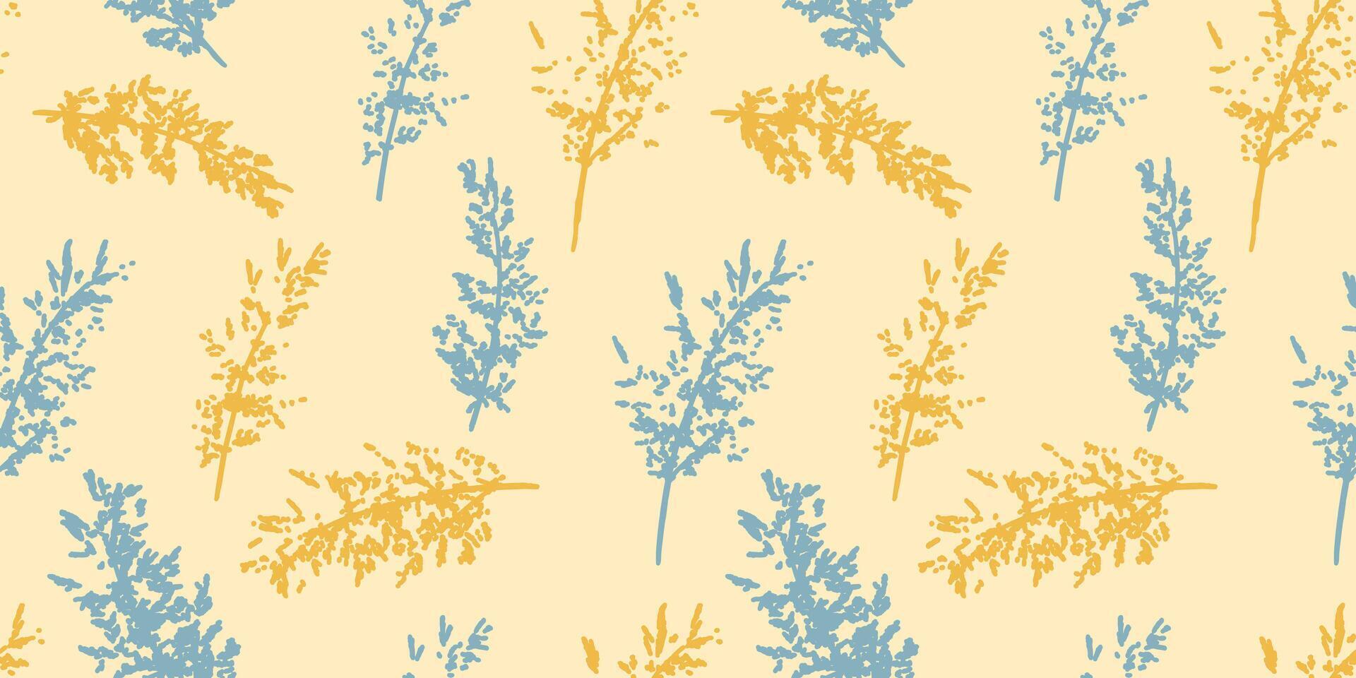 Seamless pattern with scattered botanical stems in warm mustard and soft blue tones on a light cream background, creating a fresh, playful and nature inspired decorative design Pro Vector